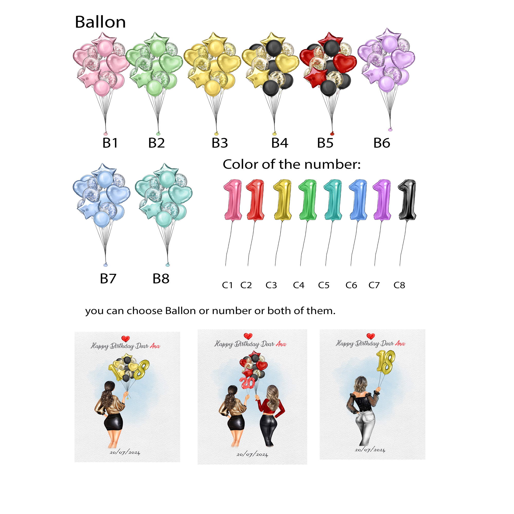 Include information such as name, skin tone, outfits, hair style for each person (Left to Right) Ballon and number if you want. Also, you can customize the quote you would like to appear in the design, following the format shown in the example.