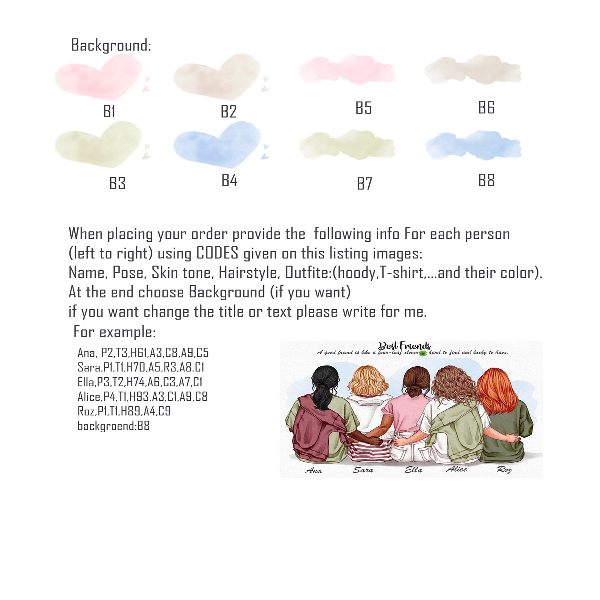 Include information such as name, pose, skin tone, outfits, hair style, ballon, number(age), cap… for each person (Left to Right). Also, you can customize the quote you would like to appear in the design and background, following the format shown in the example.