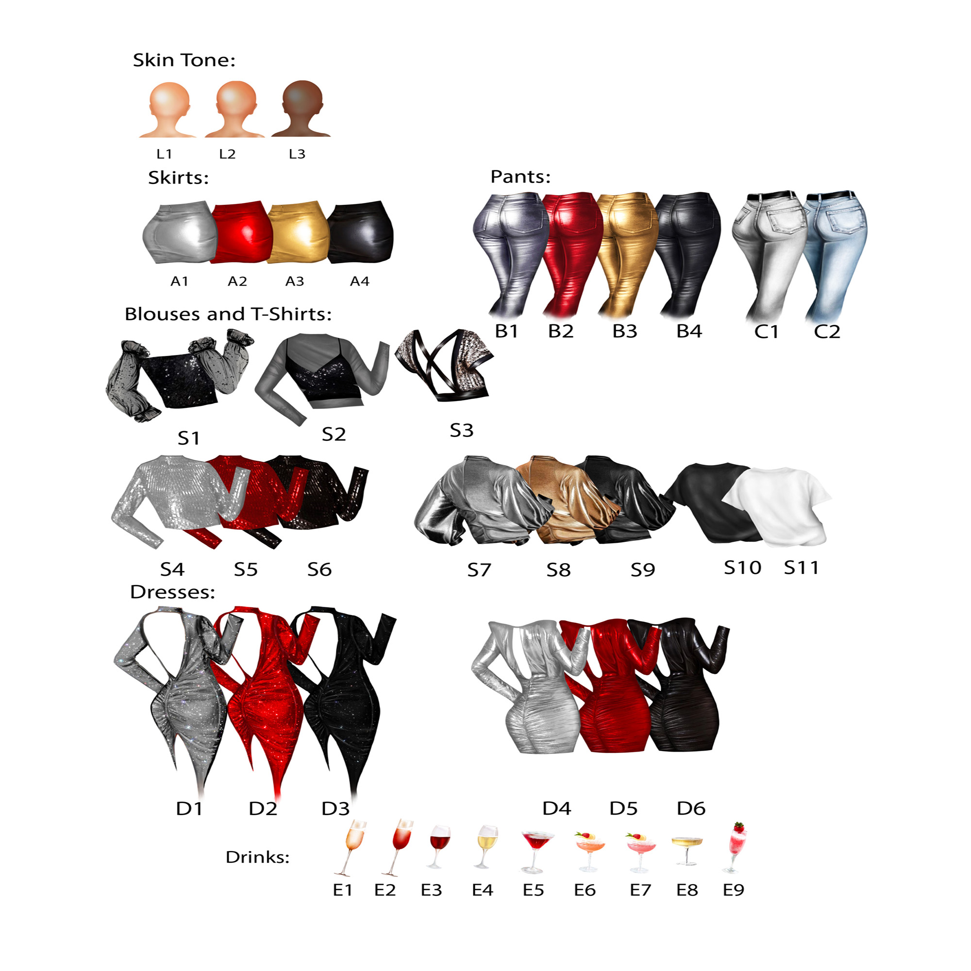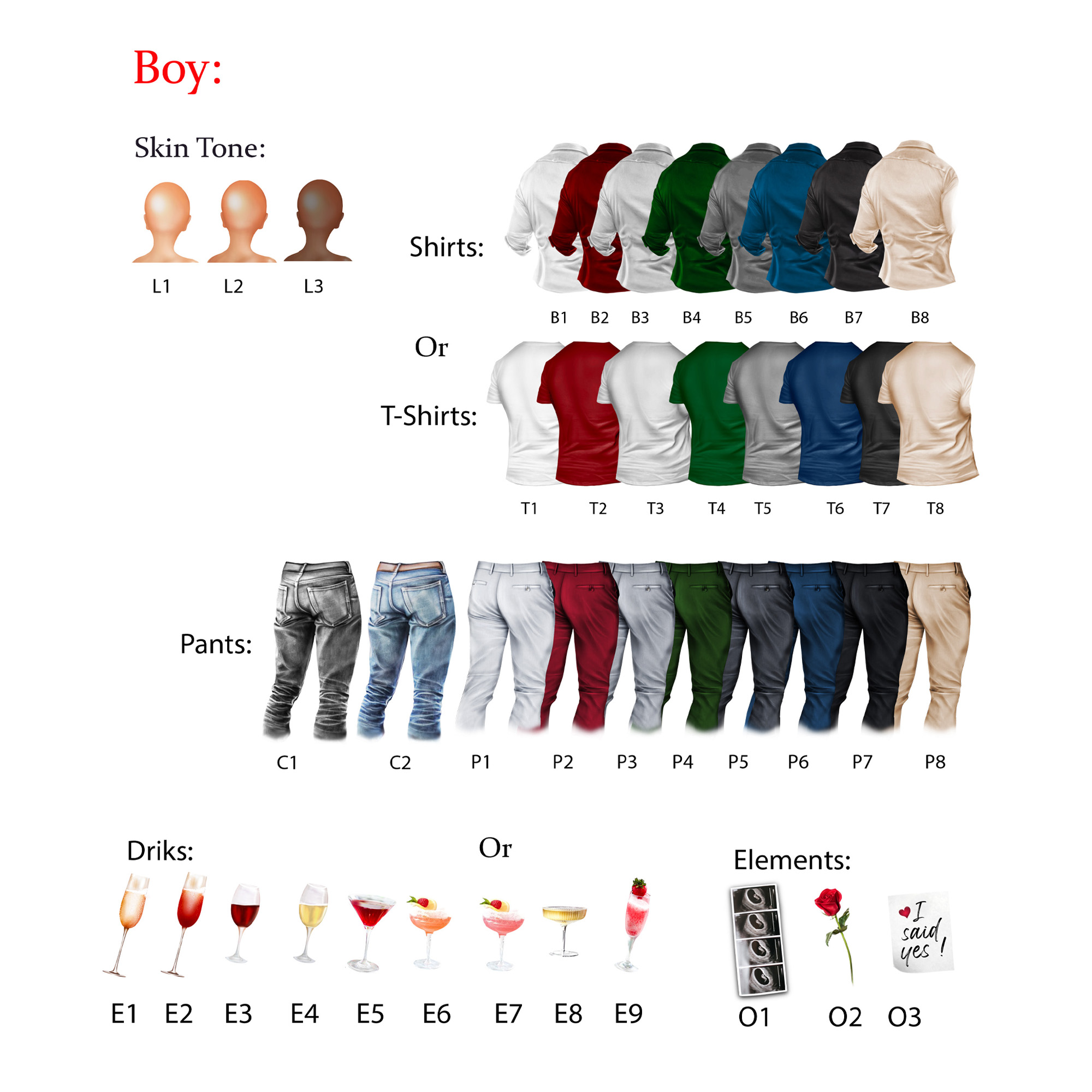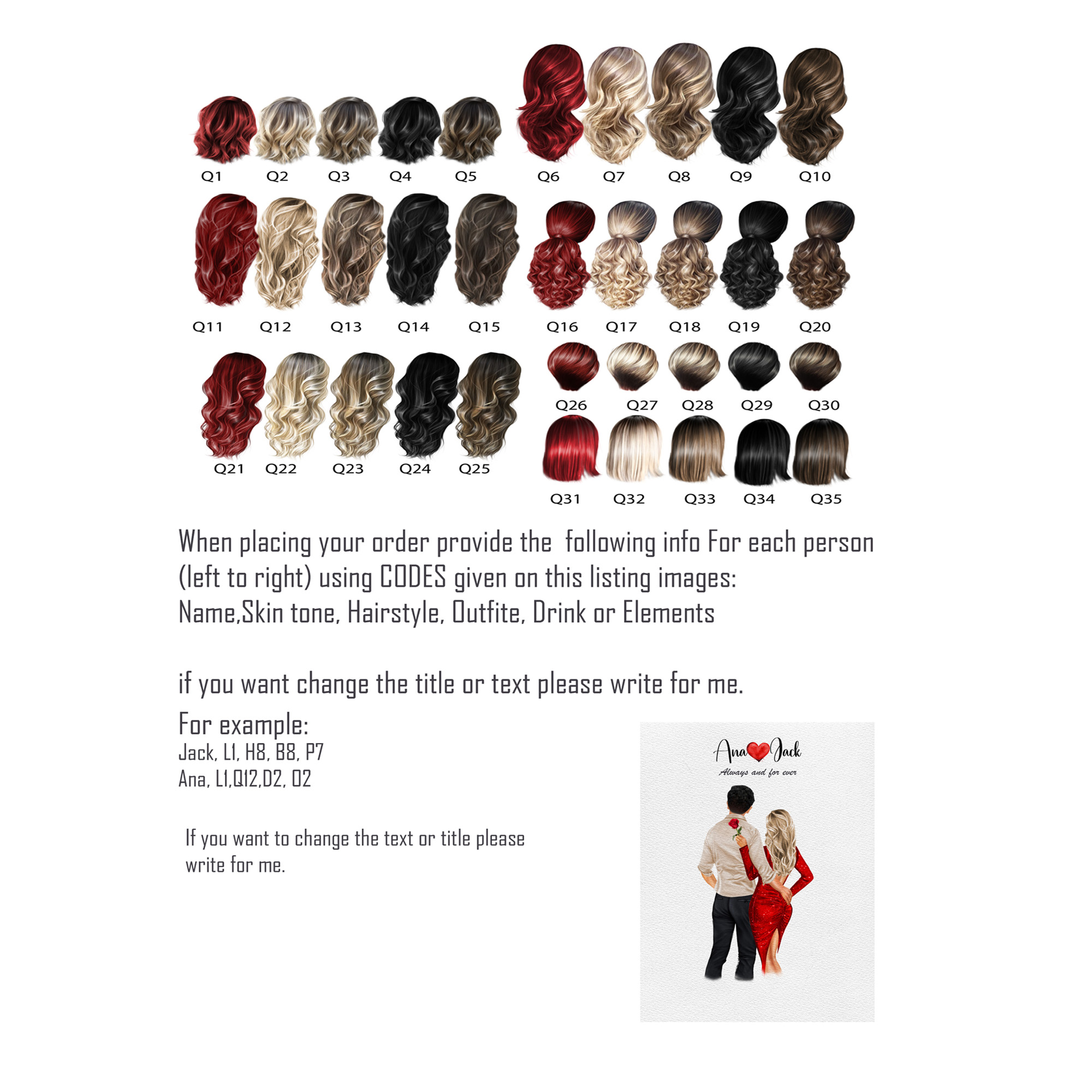 Include information such as name, skin tone, outfits, hairstyle, drink or element and the quote you would like to appear in the design, following the format shown in the example.